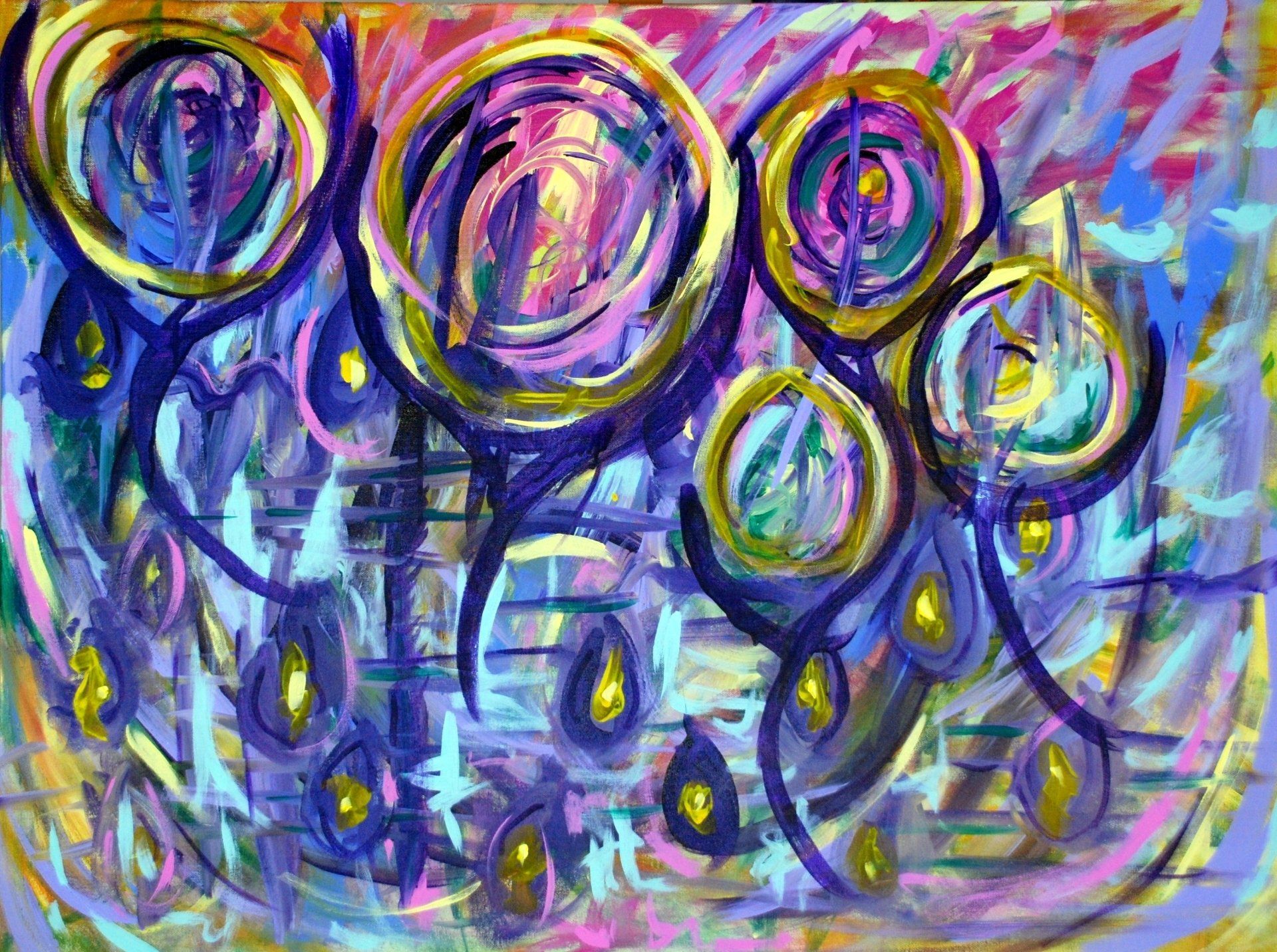 “By natural or supernatural means” inspired me. Others might see a seasonal change merely as mundane. But it is truly “Supernatural” to me. So, I explored the awe and magnificence of a winter’s sleep. The awakening of spirit in spring. That worked for me! It defined metamorphosis! So, I listened to the piece while I choose the colors and mixed them in small containers. I did a few pieces before painting “Overture Metamorphosis” to practice and developed the rhythm for the final painting at the Gala.